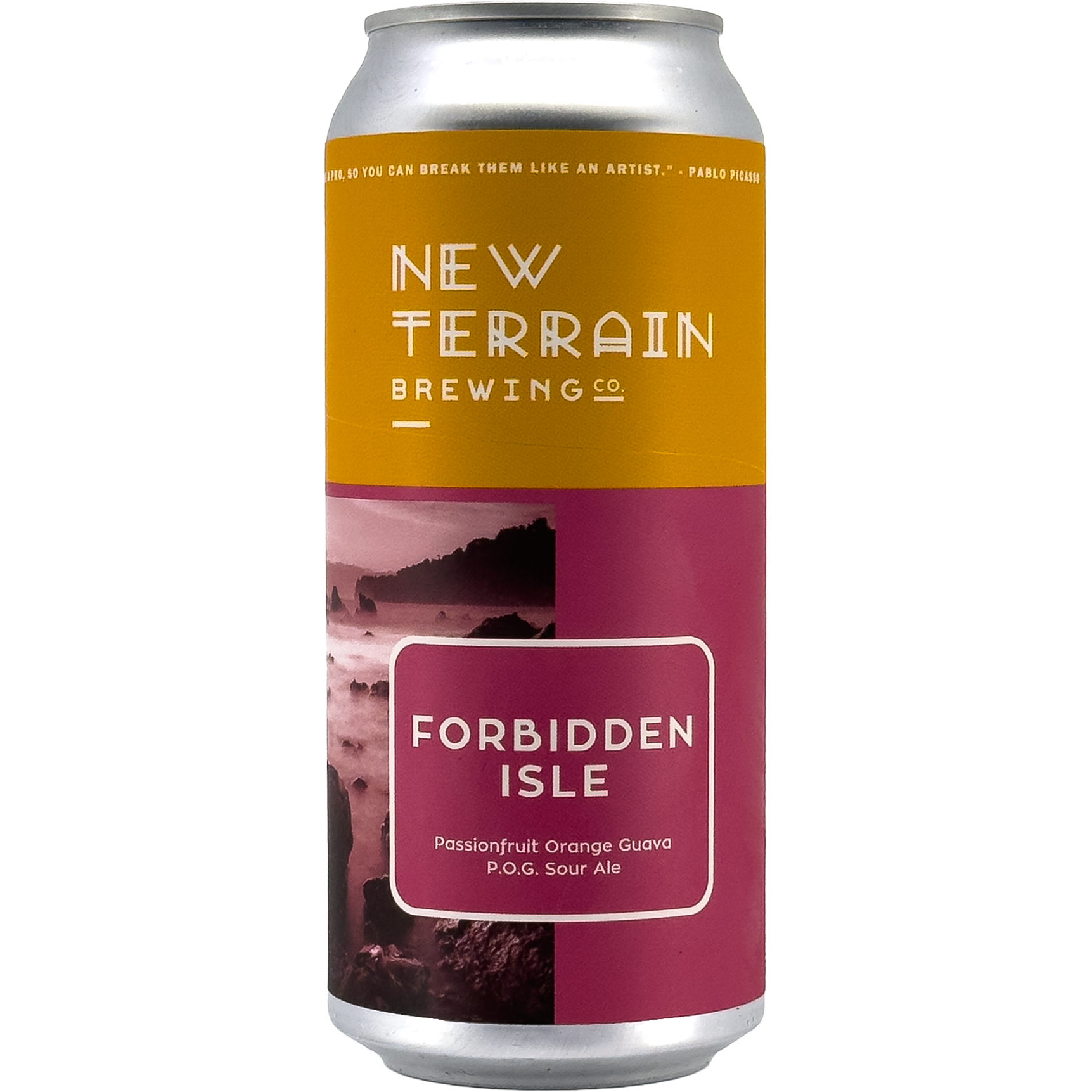 A radiant tropical escape in a can, the 2023 New Terrain Brewing 'Forbidden Isle' Sour Ale Beer, Colorado, USA, brings the lush bounty of the Pacific to the Rocky Mountains. This seasonal P.O.G. (passionfruit-orange-guava) sour ale is crafted as the perfect summer refresher, blending juicy citrus, creamy texture, and lively tartness for a taste that's both exotic and exhilarating.