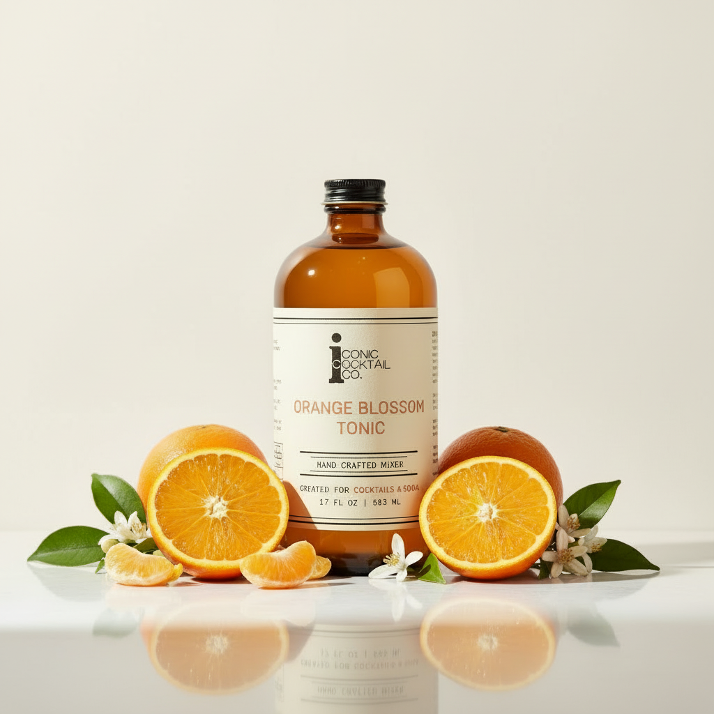 Combine 1 part Iconic Cocktail Co. Orange Blossom Tonic Mixer with 1 part preferred spirit and top with 1 part soda over fresh ice for a structured cocktail. Garnish with orange peel, edible flowers, or a sprig of rosemary to emphasize aromatic lift. For zero proof service, mix 1 part tonic mixer with 2 parts sparkling water over ice and garnish similarly. Serve well chilled in a highball or large stemmed glass to enhance aroma and effervescence.